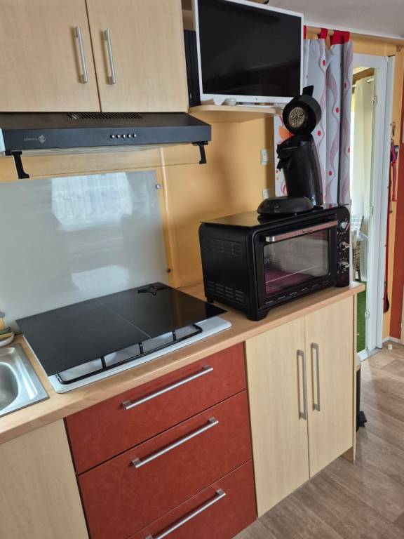 Cuisine équipée avec vaisselle fournie + four + frigo + cafetière électrique